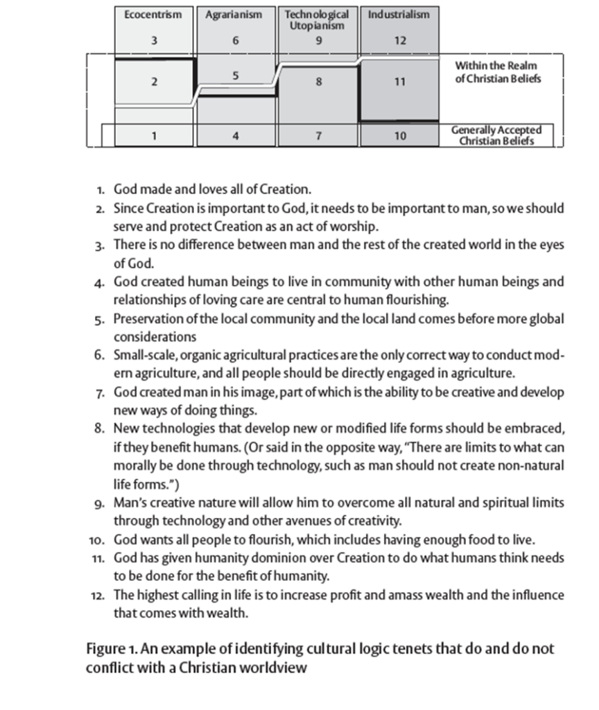 What can be said about the relationship between these Christian convictions and the cultural logics we introduced above? While none of our proposed logics can completely encapsulate any Christian’s perspective of agriculture, each also contains elements which may be considered complementary or contradictory with a Christian worldview. As we outlined above, there is no singular Christian perspective of agriculture; rather, the Christian faith contains tenets which set the broad parameters of acceptable logics.