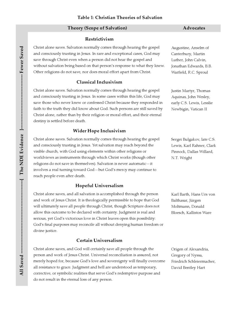 Surely the taxonomy can be improved, but I hope it captures the schools of thought well enough to make this juxtaposition meaningful: Where does the NDE evidence fit on this “scope of salvation” continuum?