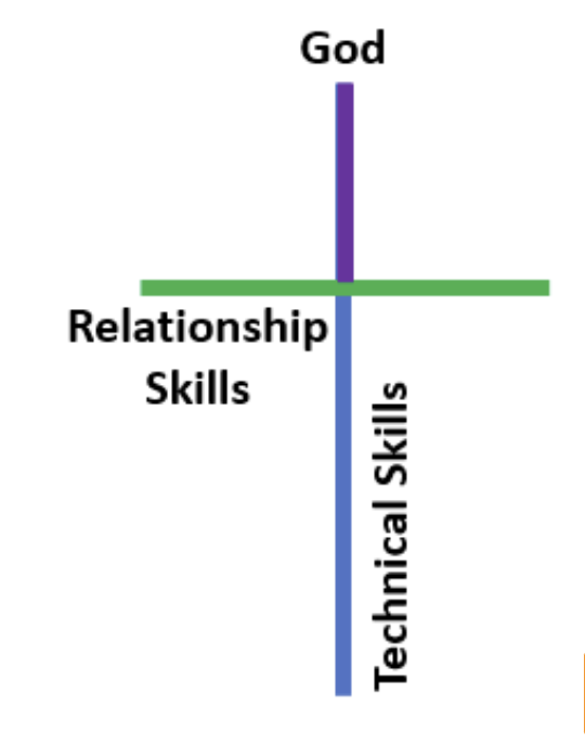 The lower vertical represents a technical foundation. The horizontal cross piece recasts professional or soft skills into relational ones that help us connect with other people. And the upper vertical points toward God, centering Him as our ultimate purpose.