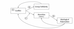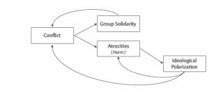 The sociologist Randall Collins, who has written several articles and two books on violence, formalized pre-existent but somewhat unsystematic social theories explaining how conflict works within social groups.9 Conflict within social groups tends to have an inherent feedback loop that amplifies the conflict across time (see Figure 1). This is because real or perceived conflict tends to clarify social group boundaries, driving people back to affinity groups, which in turn tends to further clarify and increase the initial conflict. Additionally, that conflict can, over time and once it reaches certain generally emotional thresholds, lead to atrocities (atrocities in his model are in reference to wider-spread group or identity-driven violence). While Collins’s main interest is in how and when violence breaks out, the same can apply in the absence of actual physical violence with threats, gossiping, slander, or other seemingly benign forms of action against another individual or group. As this begins to happen, not only is the initiator’s group identity and boundary clarified but they also come to solidify perceptions of the opposition. As this “violence” moves towards solidified perceptions of the other group, it tends to, again, feed back into and amplify the original perception of conflict.