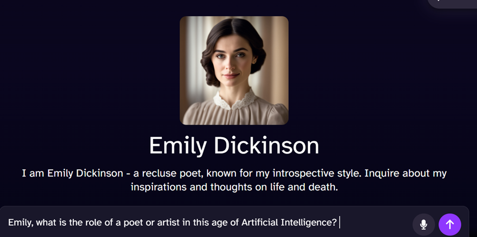 [7] DeepAI. “Emily Dickinson – AI Chat.” DeepAI. June 24, 2025. https://deepai.org/chat/emily-dickinson.